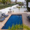 outside the villa has a spacious private garden and pool area with sun lounger and patio furniture plus a BBQ area and out dour shower.